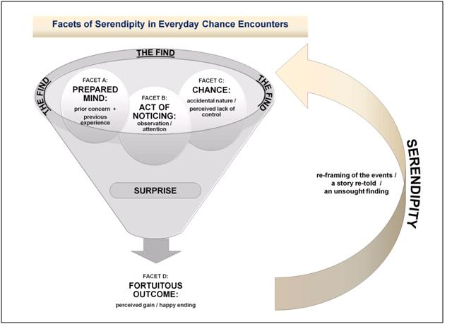 encounters in blogs. We constructed 44 queries related to accidental encounters to retrieve accounts from GoogleBlog. From among the returned results, we selected 56 accounts that provided a rich description including a mention of an accidental find and a fortuitous outcome. We employed grounded theory to identify facets of serendipity and to explore their inter-connections. Based on the literature and the data analysis, we developed a model in which the find brings together all the facets of the serendipitous encounter: a) a person with a prepared mind realizes the relevance of the find; b) there is an act of noticing involved in discovering the find; c) the find is what people encounter by chance; d) what leads to a fortuitous outcome is the find, and e) the find is the essence of the re-telling of the story, which involves reframing the encounter with the find as serendipitous.